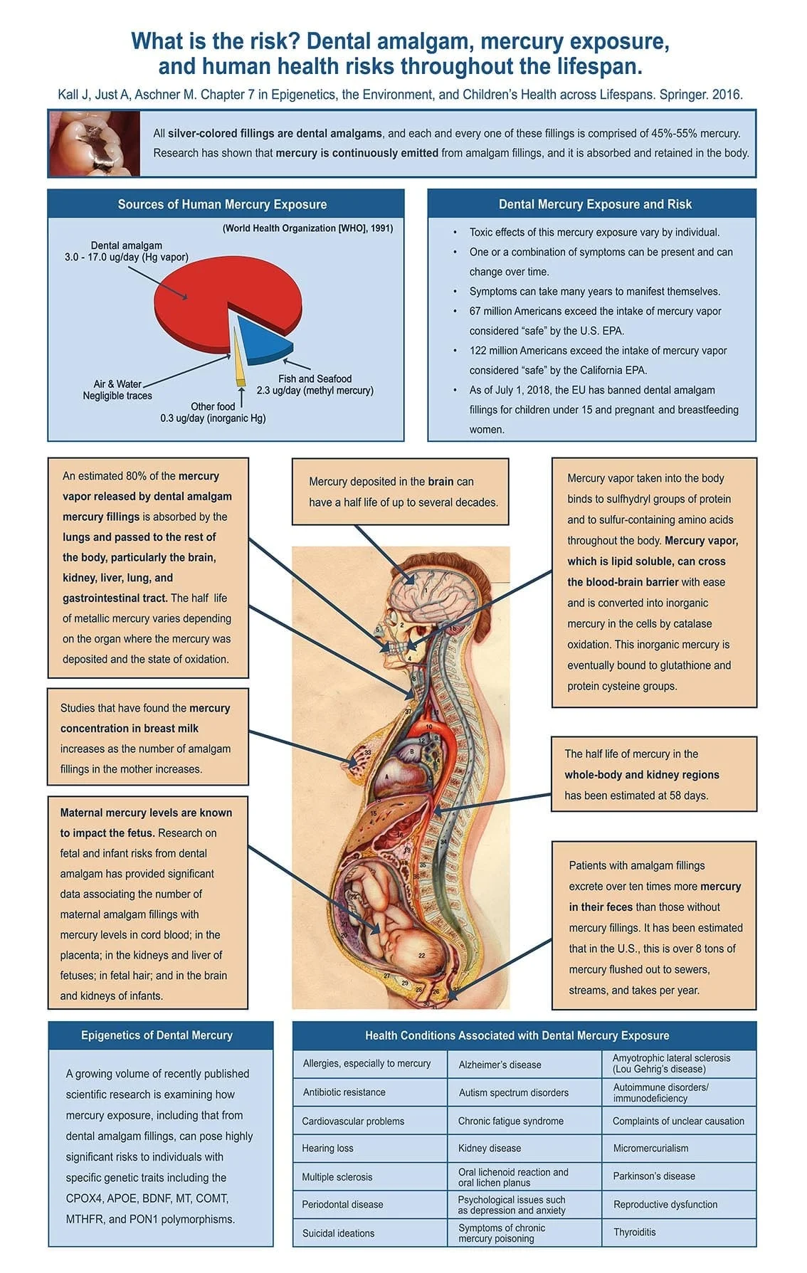 Cette infographie a été créée sous forme de résumé d'affiche pour un chapitre de livre intitulé «Quel est le risque? Amalgame dentaire, exposition au mercure et risques pour la santé humaine tout au long de la vie »par John Kall, DMD, Amanda Just, MS, et Michael Aschner, PhD de l'IAOMT. Ce chapitre fait partie de la publication Springer 2016 Epigenetics, the Environment, and Children's Health Across Lifespans. L'infographie explore les différentes façons dont l'utilisation du mercure dentaire dans les obturations en amalgame pose des risques pour la santé humaine.